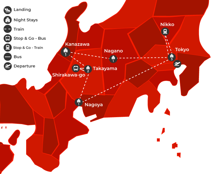 Visit scenic Nikko, home to the lavishly ornate Toshogu Shrine. Explore beautiful Kanazawa with its preserved teahouse districts and thriving geisha culture. Enjoy Nagano, known for its stunning natural scenery and its histoy of ninjas. Take a day trip to see the traditional farmhouses of the Shirakawago area. And visit Nagoya, Japan's fourth largest city and home to the awe-inspiing Nagoya Castle.
