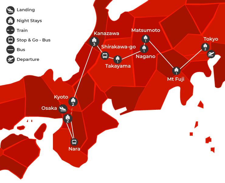 Visit bustling Osaka with its brightly lit streets and fantastic food culture. Take a trip to ancient Nara, a city steeped in history. Walk the streets of Kyoto and take a step back in time as you explore its old temples and shrines. Visit Takayama, a wonderfully preserved old merchant town of the Edo period and see the famous 250-year-old farmhouses of Shirakawago. Step inside one of Japan's last remaining original castles in Matsumoto. And admire the lofty, snow-capped peak of Mount Fuji and be treated to breath-taking views of the surrounding landscape.